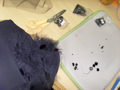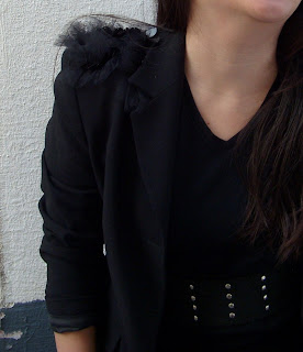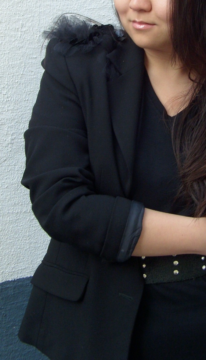 Foi então que surgiu a idéia de costurar algumas camadas de tule aos ombros e bordá-los com paetês variados. Comprei um pedaço de tule preto, e cortando-o em tiras de mais ou menos 7 centímetros fui franzindo o material e costurando à mão por cima das ombreiras do blazer. Desta forma, fiz algumas camadas descoordenadas e franzidas de tule, e sobre ele bordei os paetês aleatoriamente.