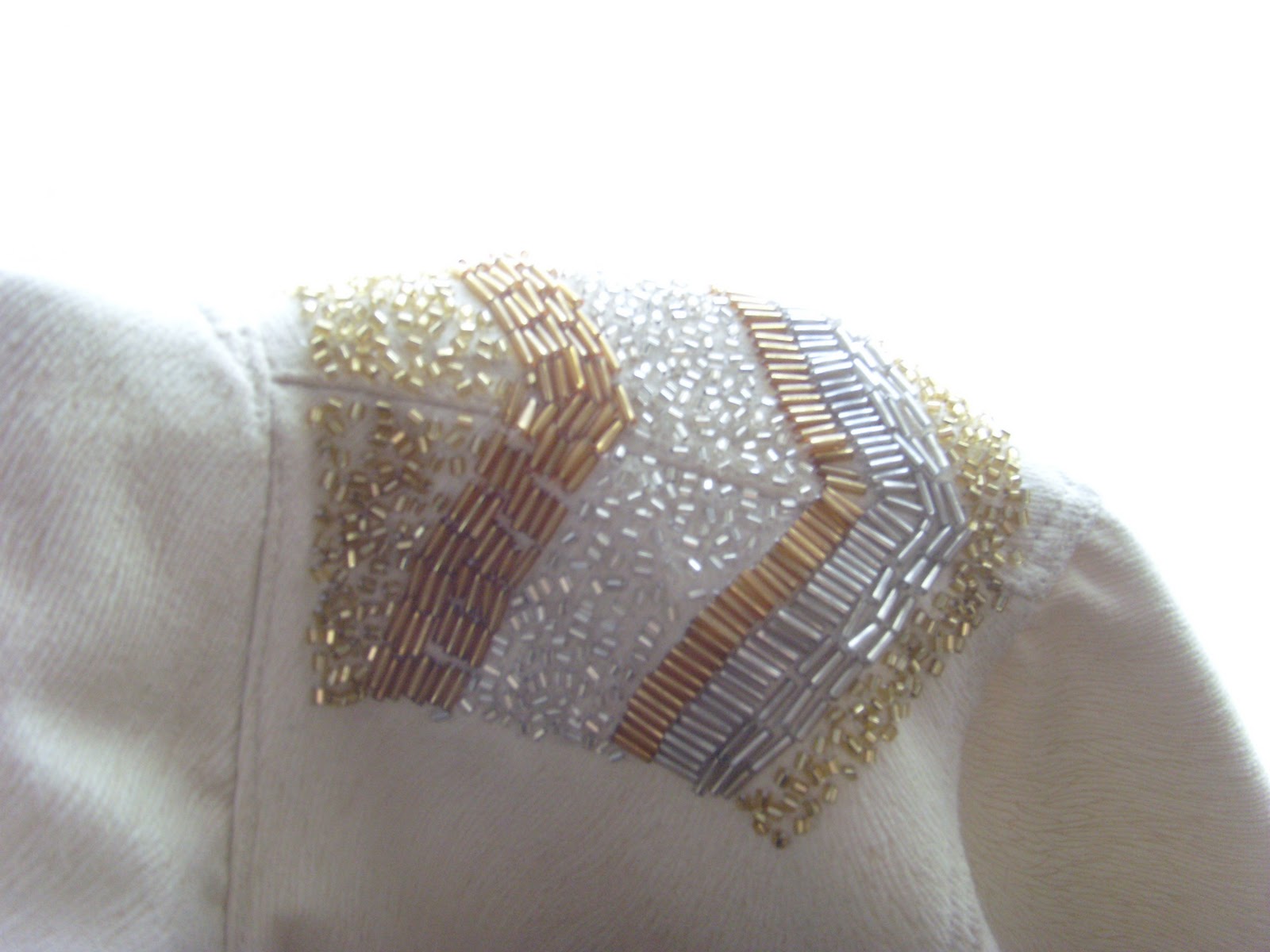 Logo finalizada a peça tive a idéia de bordar o ombro, mas com um ar mais militar já essa que tem sido uma tendência. Porém, para dar um ar mais sofisticado, ao invés de bordar apenas uma pala ou um algo em tecido bordei canutilhos e vidrilhos que brilhariam mais dando um boost maior.
