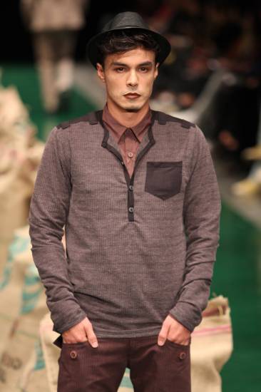 Nas passarelas, um clima do período cafeeiro, sacos de cafés a dividiam de ponta a ponta, formando um corredor para os modelos. O estilista propôs na exibição, listras e, principalmente, o geometrismo.