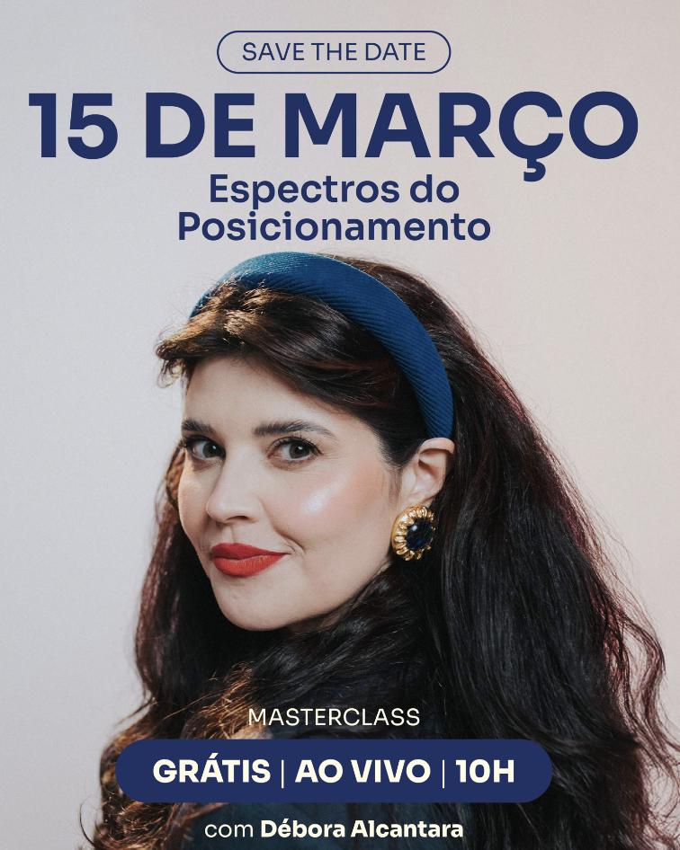 No dia 15 de março de 2025, às 10h horário de brasília, acontecerá a Edição 2 da Masterclass "Espectros do Posicionamento", com Débora Alcantara. Depois do sucesso da primeira edição, este novo encontro promete aprofundar ainda mais os conceitos essenciais para que você consiga posicionar sua marca de forma autêntica e estratégica.